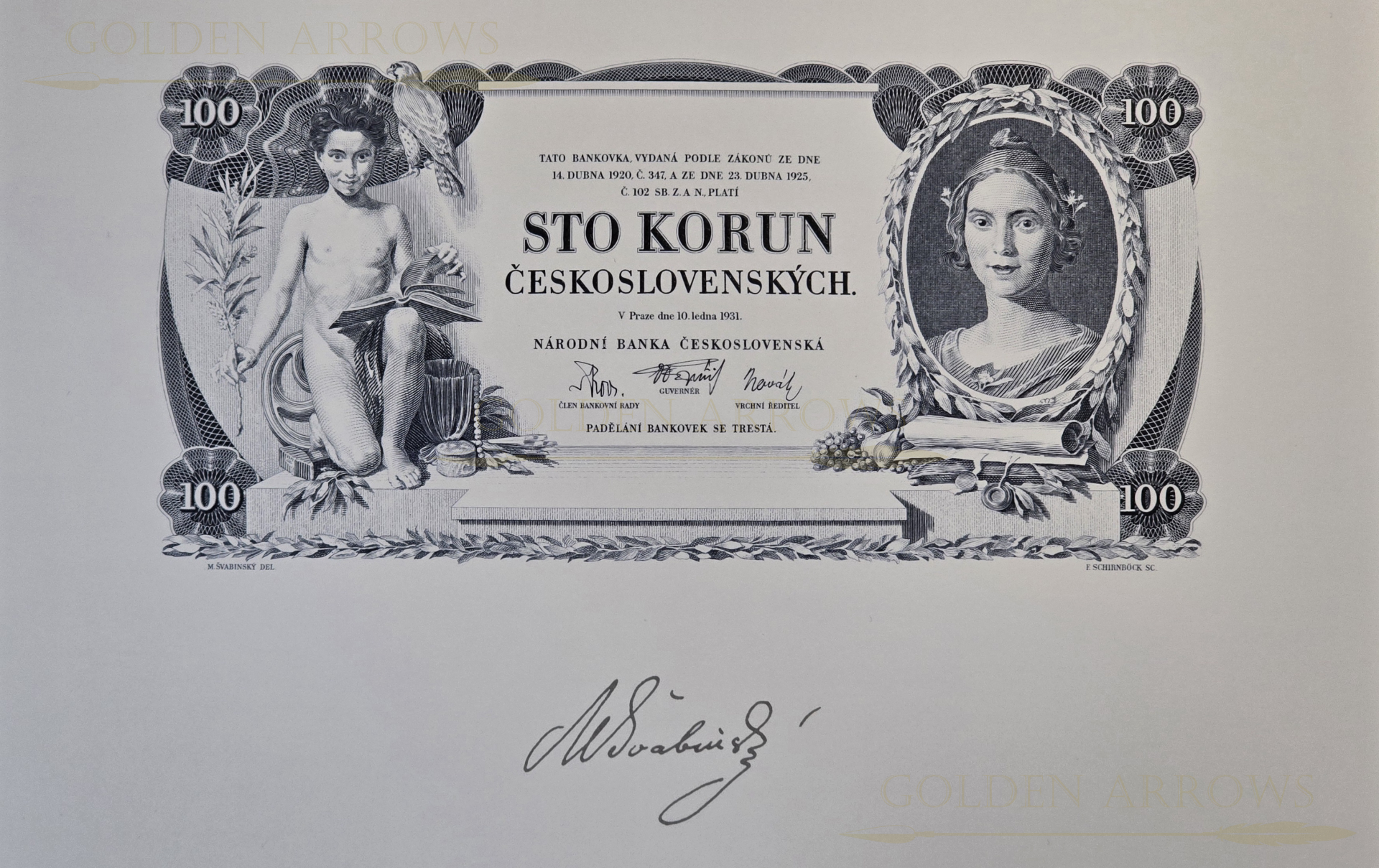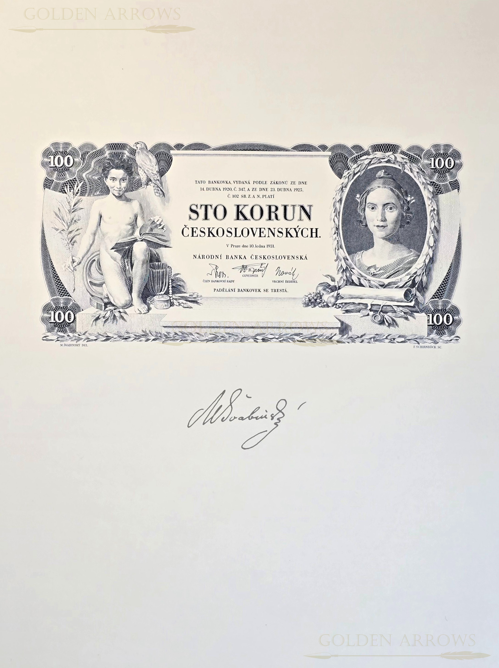 Pamětní černotisk přední strany stokorunové bankovky z roku 1931 podle návrhu Maxe Švabinského, vydala Státní tiskárna cenin s.p. u příležitosti 90 - tého výročí svého založení. Formát grafického listu A4. Originální liniový hlubotisk v barvě tmavě modré s faksimilí podpisu malíře Maxe Švabinského k jehož realizaci návrhu bankovky přistoupila NÁRODNÍ BANKA ČESKOSLOVENSKÁ.